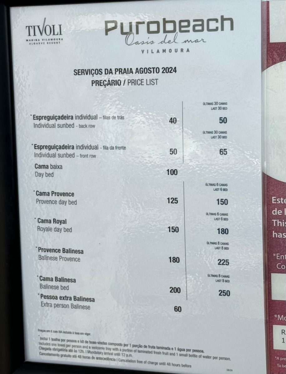 Pro tip: If you prefer not to dine on the terrace, you have the option to rent a luxurious chair. A single chair costs 40 to 60 euros per day, a cot is priced at 100 to 125 euros, and a Balinese bed can be rented for 130 to 180 euros. All rentals include fresh fruit, water, and a choice of wine or champagne.