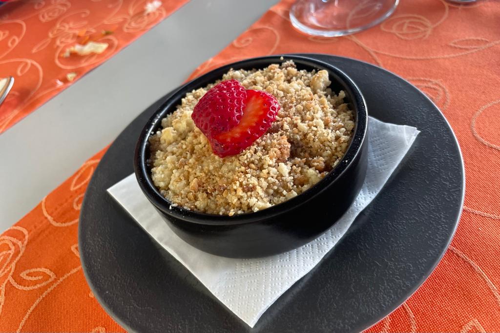To round off this exceptional meal, you're presented with two delightful desserts - the apple crumble and the fruit salad, both the perfect balance of sweetness and freshness.