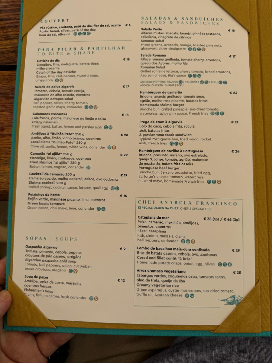 - Gaspacho Algarvio (€9): Tomato, bell pepper, onion, cucumber, bread croutons, oregano 🌿