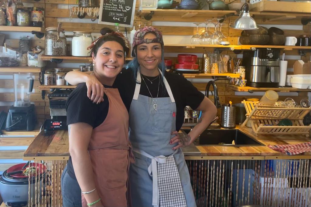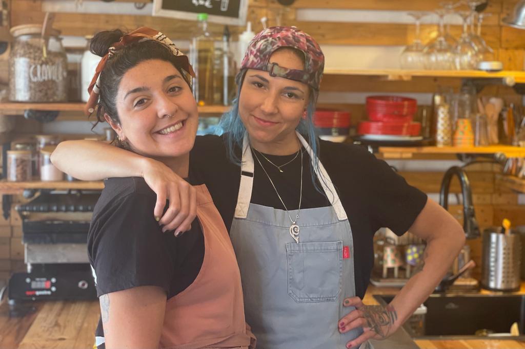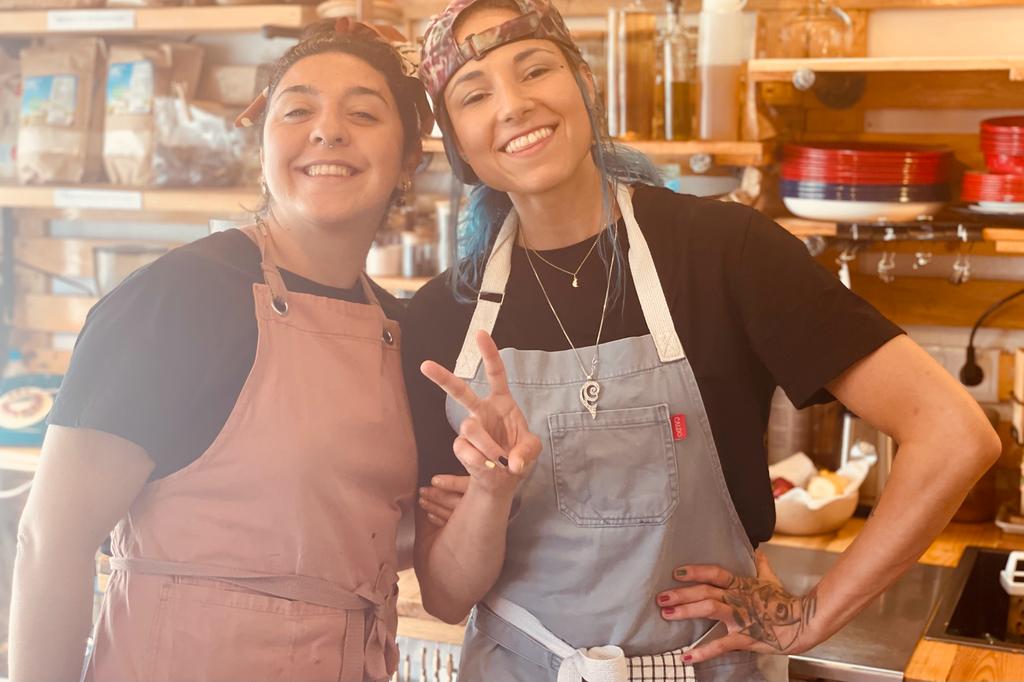 Two enthusiastic girls make the food and juices, and do the serving.