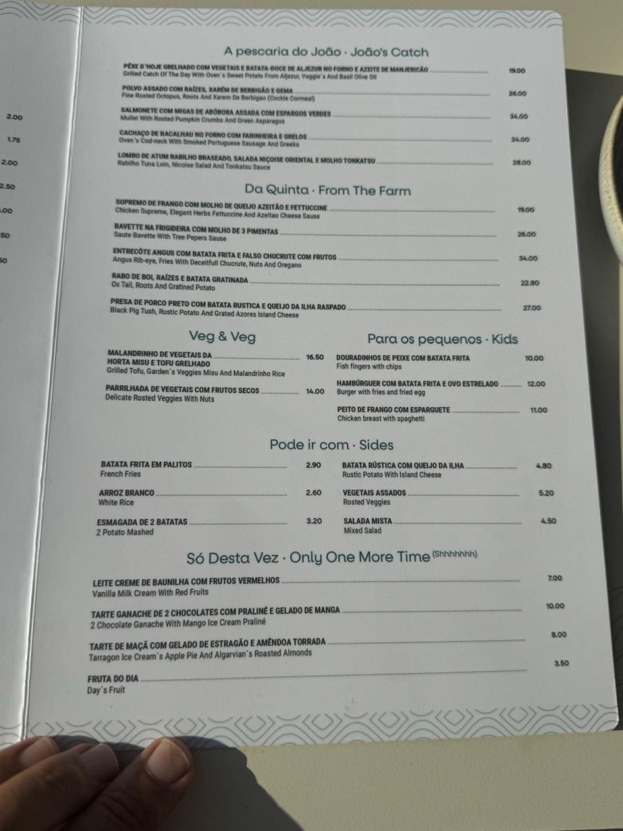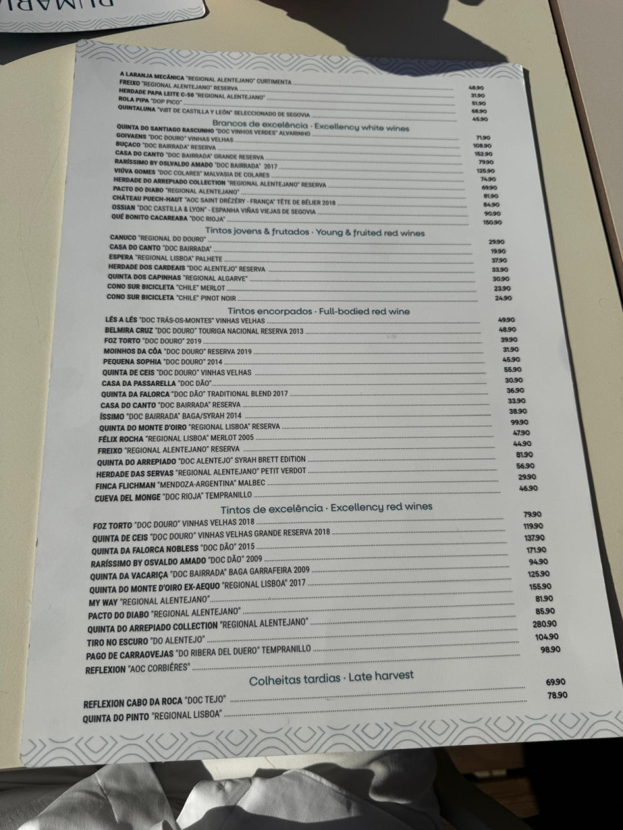 A highlight is the unique organic/biologic wine from the Lisbon region. This white wine, which has the depth of a red wine but retains the freshness of white, is a must-try (€8.50 per glass).