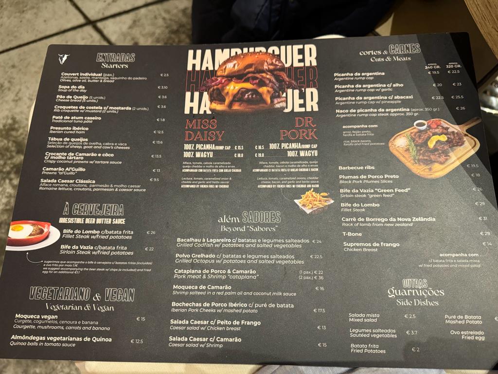 Sabores do Churrasco offers a diverse menu with a focus on meat dishes, but it also caters to seafood lovers with options like codfish (€24) and chicken breast (€14). For those seeking vegetarian or vegan options, the menu includes delights such as Caesar salad (€13), Quinoa meatballs in tomato sauce (€12.50), and Moqueca (€15).