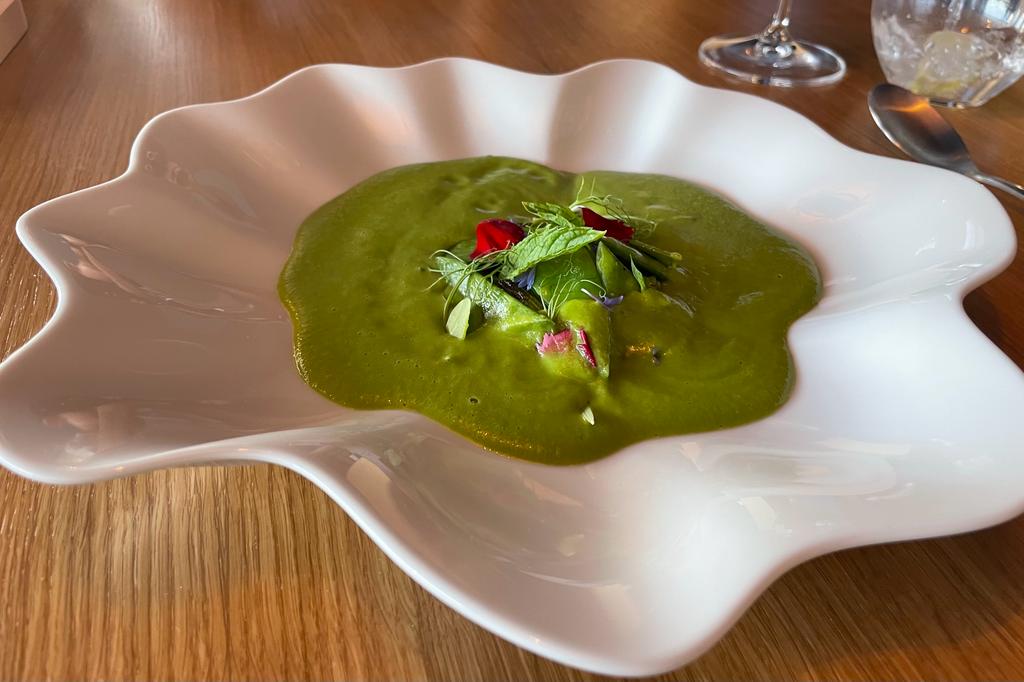 To start our meal, my son, Elyas, opts for a super nice fresh vegetable soup while I enjoy a pea soup with generous portions of asparagus. The flavors are exquisite, and the quality is on par with Michelin-level cuisine. The attention to detail in both presentation and taste is truly impressive.