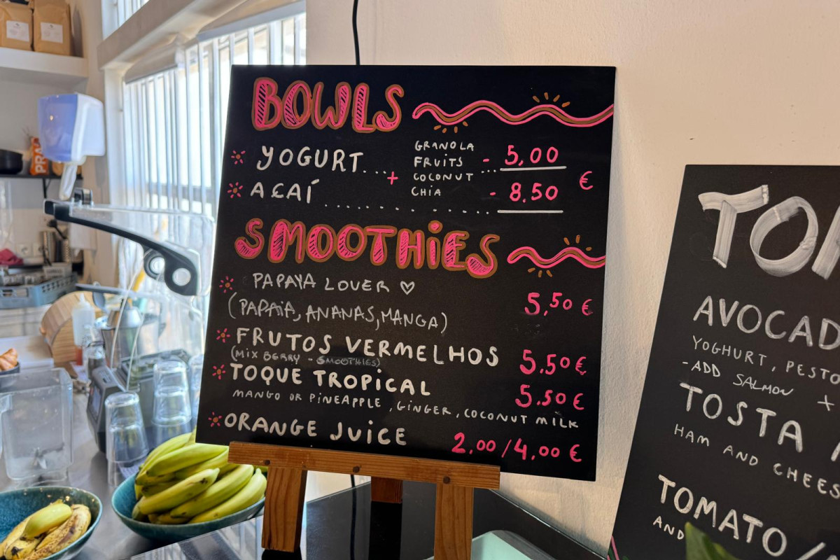 An espresso costs €1.20, while an americano is priced at €2.20. Add oat milk for just €0.30. Fresh orange juice is available for €2, and a smoothie is priced at €5.50.