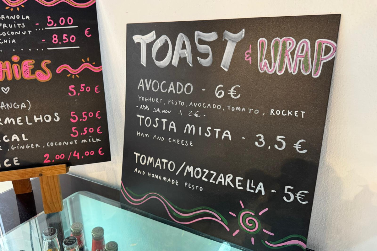 For something more filling, an acai bowl (which can be made vegan and gluten-free) is €8.50. A ham and cheese toast is priced at €3.50, an avocado toast with pesto, arugula, and tomato costs €6, and a wrap with tomato, mozzarella, and pesto is €5.
