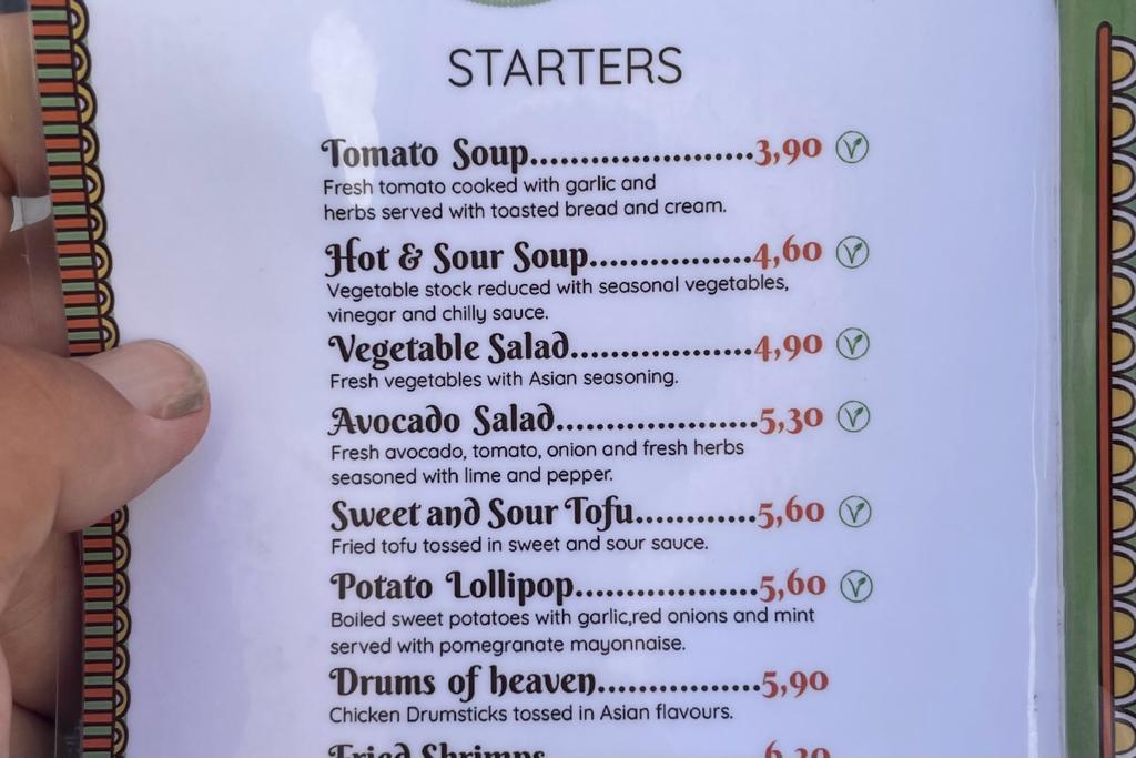 Soup 3,90. Salads from 4,90. Mains from 12,60