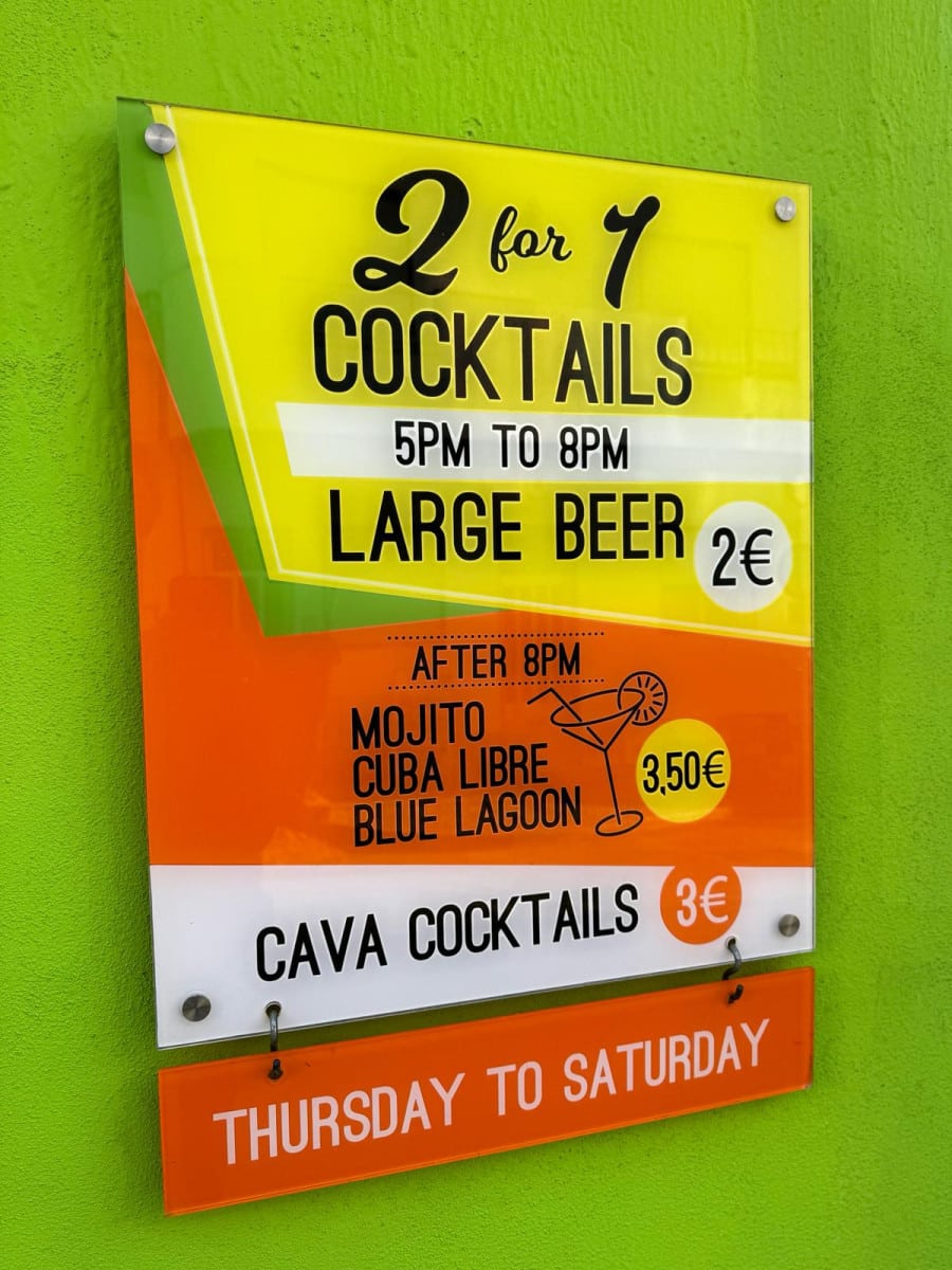 Don't miss out! During happy hour from 5:00 PM to 8:00 PM, Thursday to Saturday, you can take advantage of fantastic deals such as 2-for-1 cocktails and a large beer for only €2. After 8:00 PM, you can savor Mojitos, Cuba Libres, and Blue Lagoons for just €3.50 each. 🕔