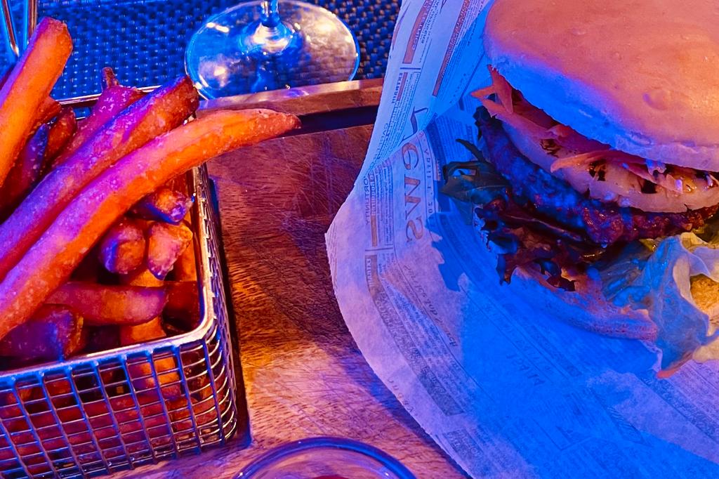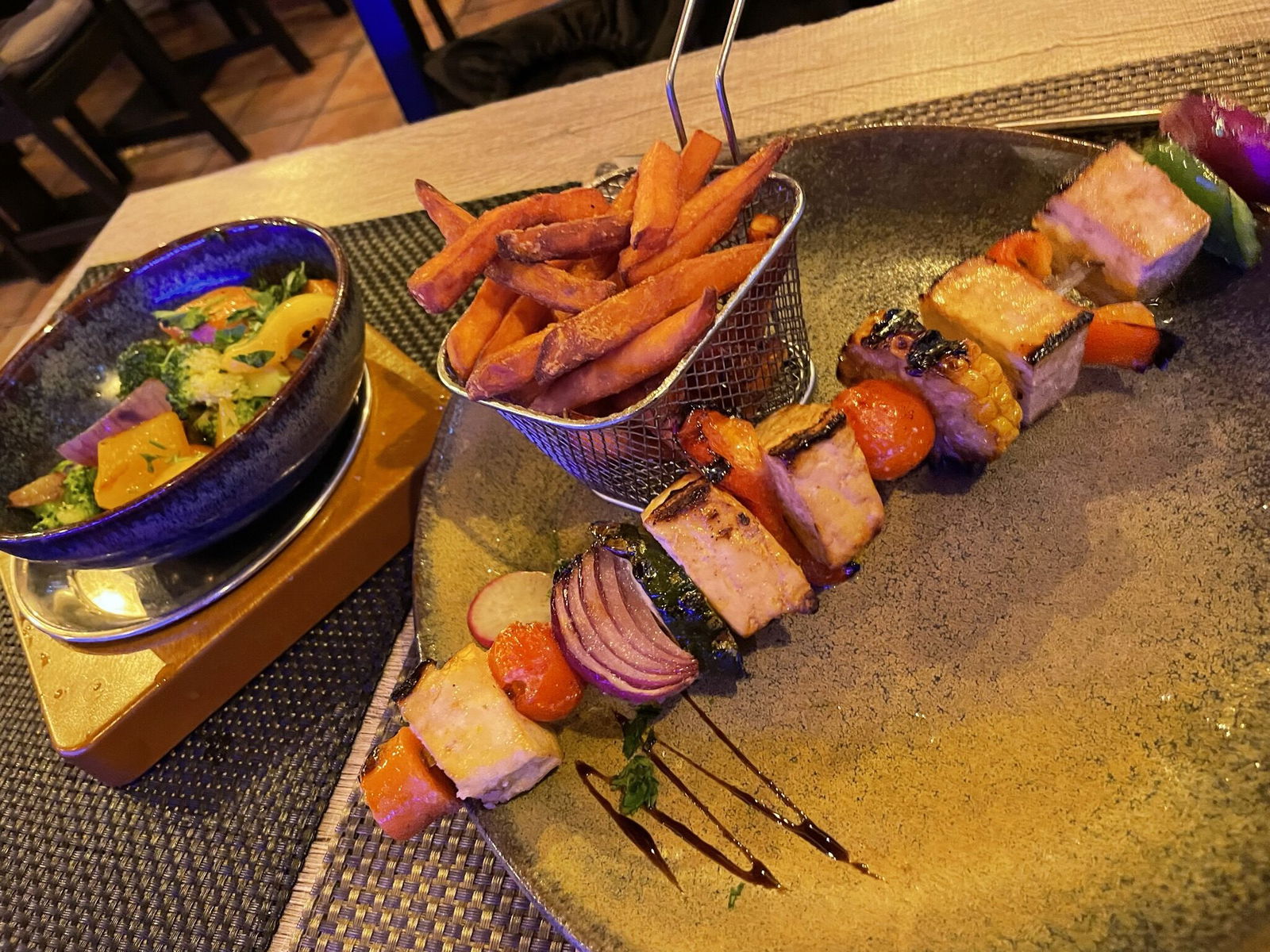 We choose the Beyond burger ( vegan and gluten-free), served with delicious sweet potato fries. This one costs only 10.90. We also order the tofu skewer (14.90), which looks beautiful and is served with vegetables and fries. Both dishes taste very good. For dessert we take a fresh fruit salad (which could have been a bit bigger), and a delicious Algarvia cake.