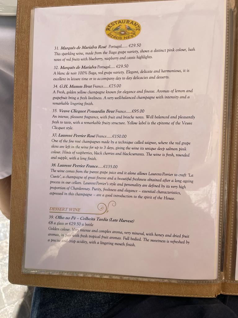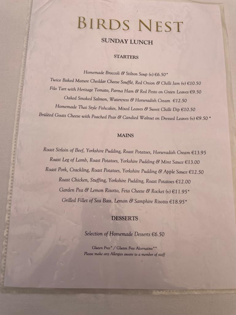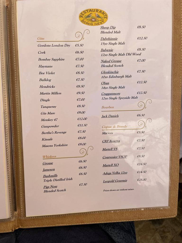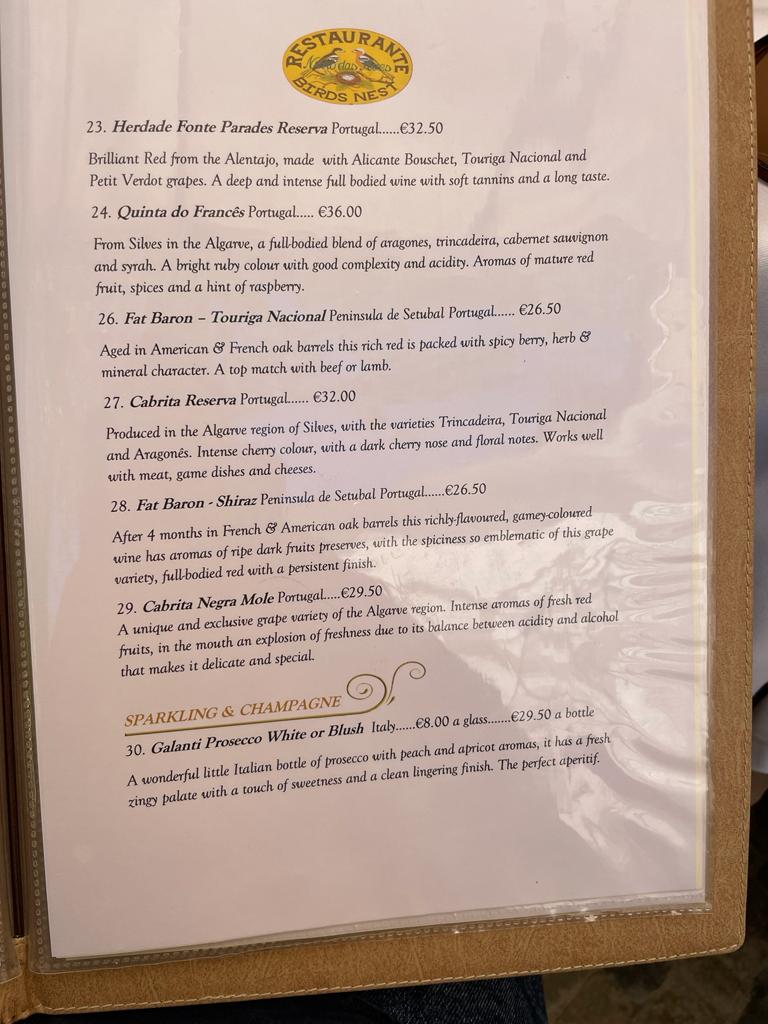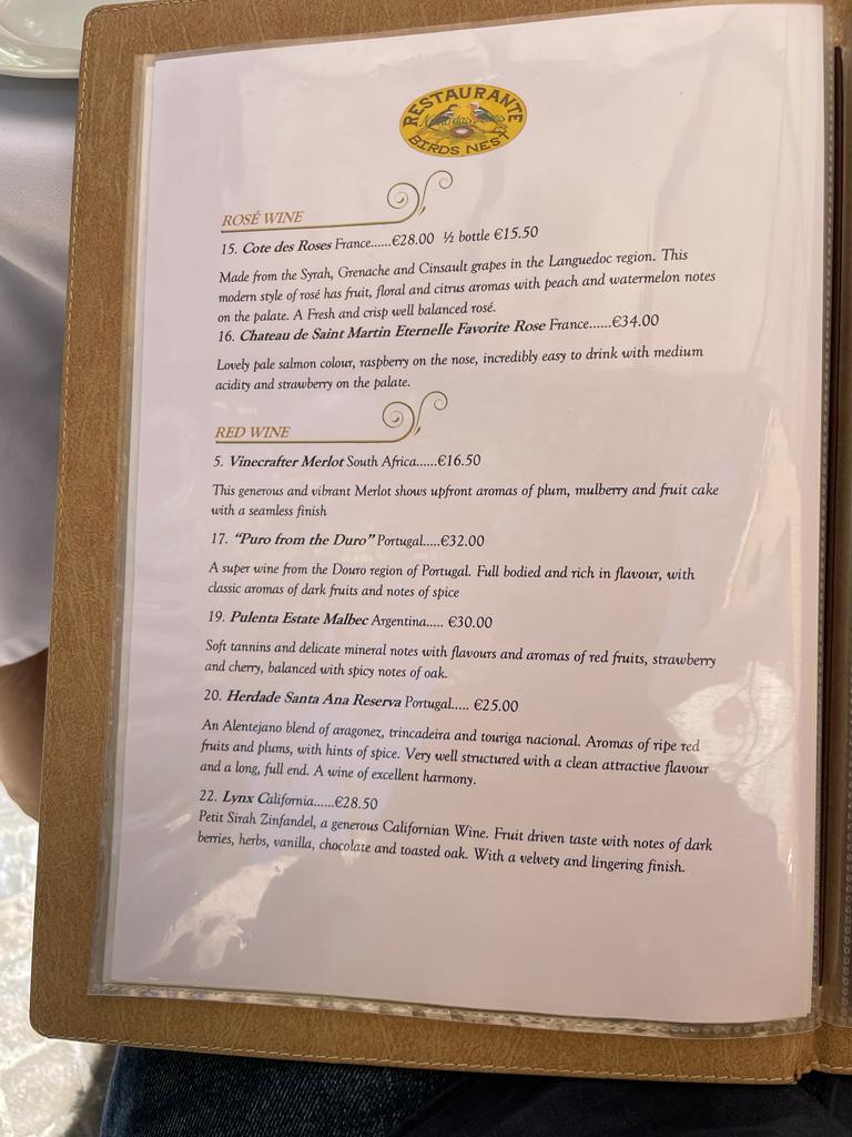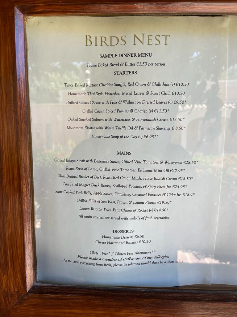 The Birds Nest menu features fish, meat and vegetarian main courses (11.95-18.95 euro).