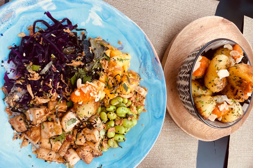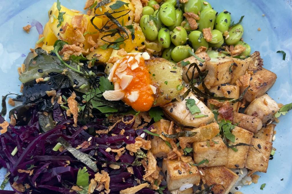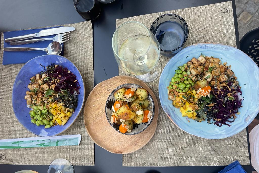 Tapas (8,-) Sushi (8,-), Poke bowl with tofu and mango (9.50), and a daily menu (12 euros).