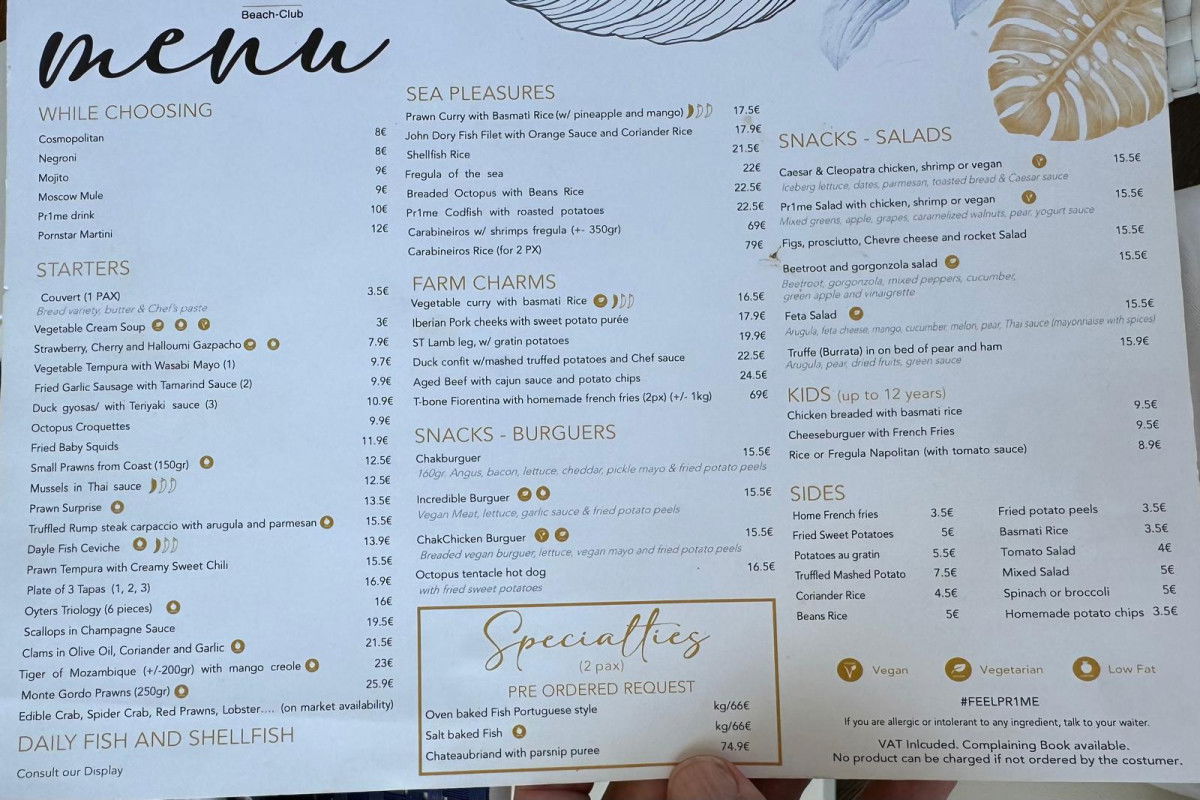 The Pr1me Beach Club has a fantastic location with a breathtaking view, especially from the rooftop at sunset. The dishes are tasty but simple for the price.
