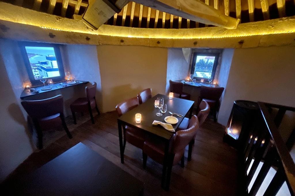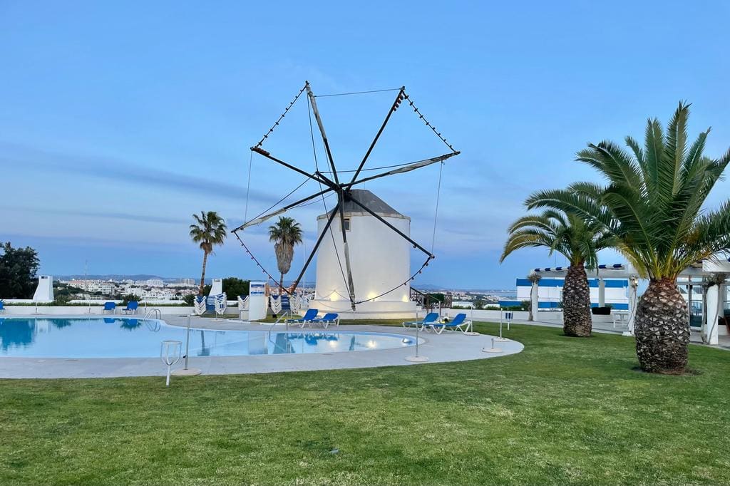 At the top of this old windmill, there is a very small restaurant with only 4 tables. Two tables are situated in front of the 2 windows (the other 2 have no view....) Only one of the windows has a fantastic view of the entire city of Albufeira and beach, so ask for that 1 table when you book!