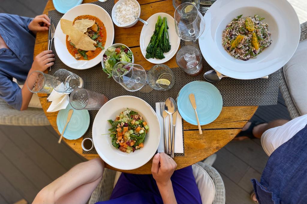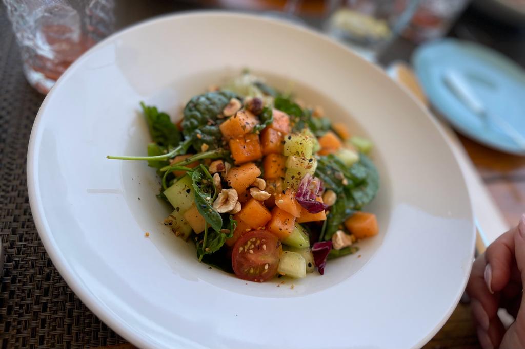 To start our lunch, we indulged in a refreshing glass of cold tomato juice, followed by our chosen main courses. Marlot enjoyed a delightful salad with melon, Elyas relished a flavorful orange curry, and I savored a delicious risotto.